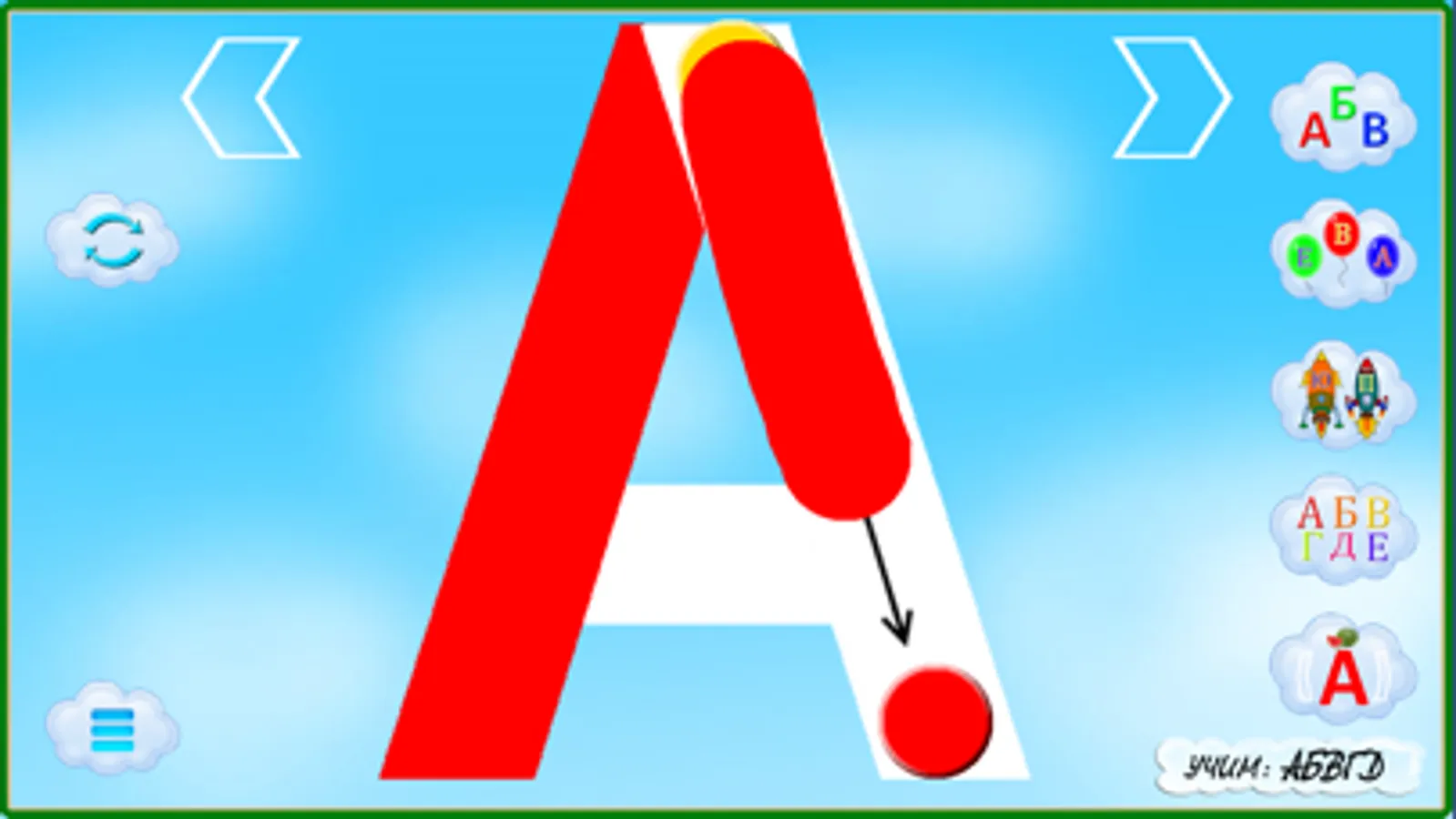 Здесь малыш учится писать буквы, для правильного написания буквы, каждый элемент буквы снабжён стрелкой показывающей направления движения пальца и двумя кружочками: желтый для начала, красный для конца. Для облегчения написания, сложные буквы разбиты на несколько элементов букв.