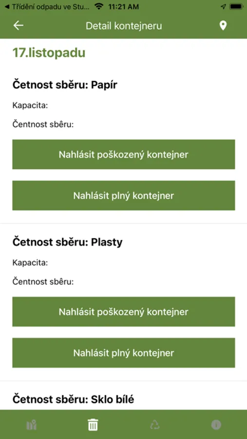 Mobilní aplikace umožňuje nahlásit přeplněný nebo poškozený kontejner ve vašem městě. Aplikace také poskytuje kompletní informace o třídění odpadu.