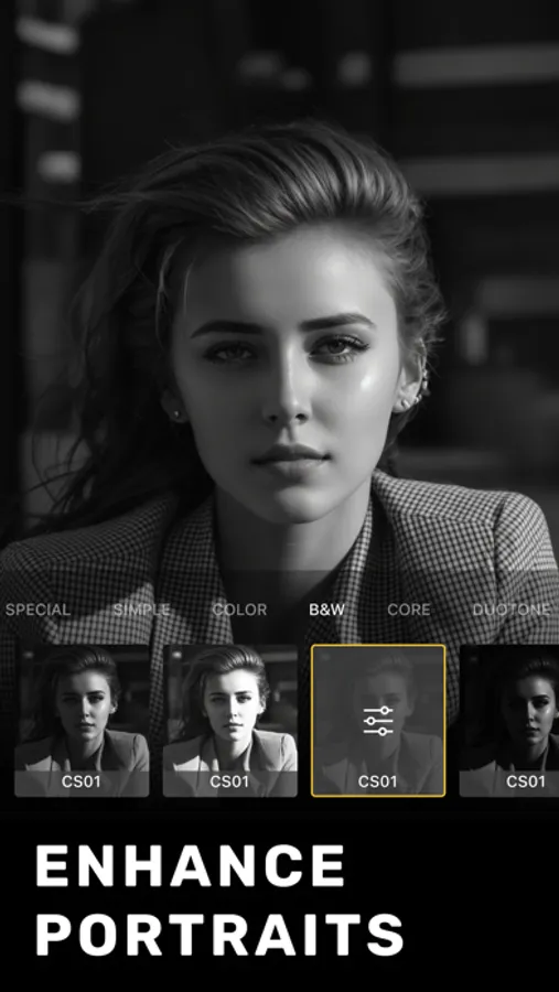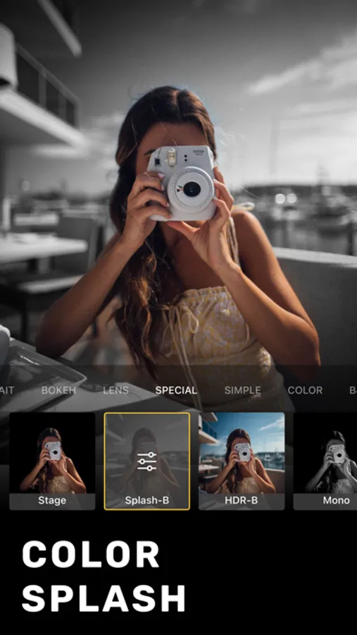 - Unique portrait effects (HDR, studio, mono, stage, detail, color splash, stylize, grain) that are carefully crafted for portrait photos.