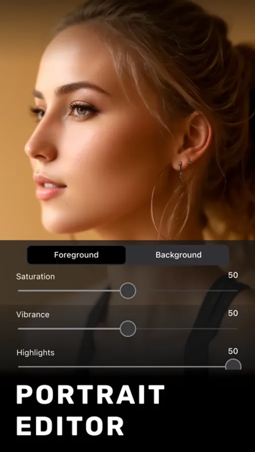 - Adjust brightness, contrast, saturation, highlights, shadows, temperature, and tint of the background and foreground separately.