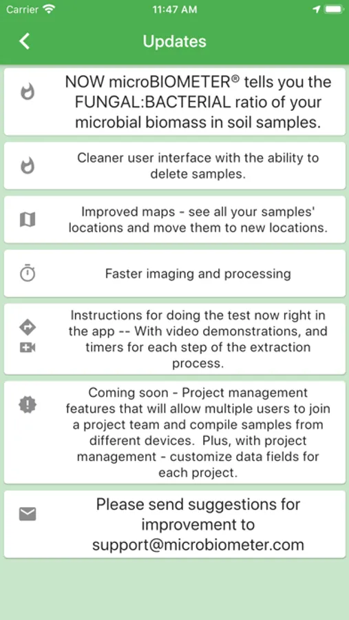 For users of Prolific Earth Sciences testing kits, the microBIOMETER® app digitally analyzes and organizes test card readings for tracking soil health. The microBIOMETER® app can be used to: