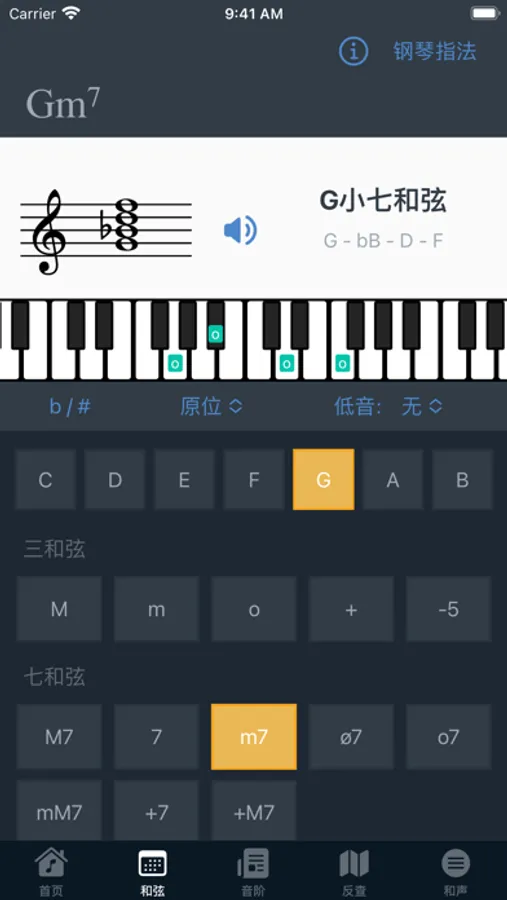 -【和弦切换】通过切换根音、和弦转位和低音,快速查询和弦对照:1)五线谱位置。2)钢琴键盘位置。3)组成和弦的各音。4)和弦标记名