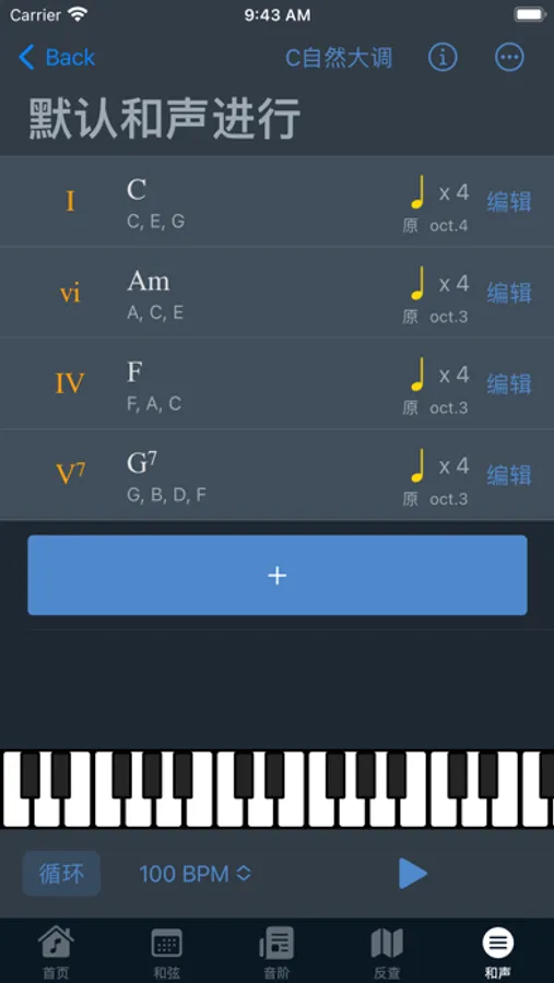 -【创建和声进行】对于常用的和弦收藏起来,以便于学习或作曲时快速使用。例如常用的 1-6-4-5常用于流行歌的创作,还有常用的卡农进行1-5-6-3-4-1-4-5。提高使用效率才是APP最大的价值所在,收藏自己常用的和弦把。支持循环播放、设置播放速度和每个和弦的节拍数。