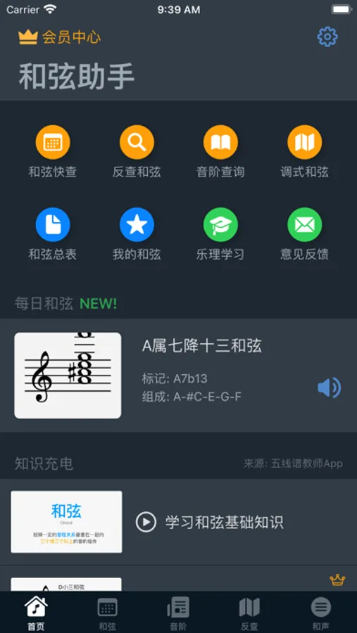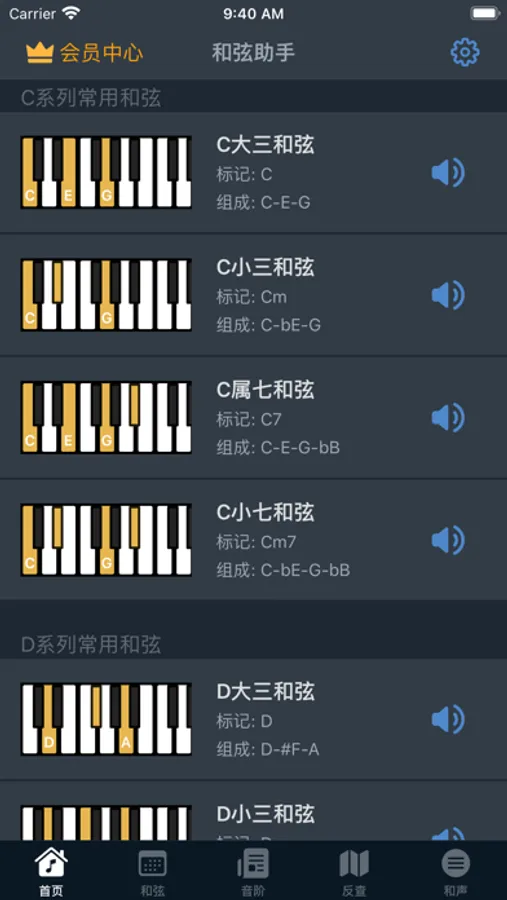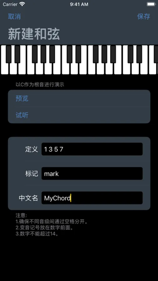 -【创建和弦】可根据自己的需要来设计新和弦类型。例如规则:1 3 5 b7 对应的是属七和弦,而规则1 3 5 b7 9对应的是九和弦等等。支持查看/删除自己的和弦。有个性的音乐的关键在于,使用属于自己的和弦,打造自己的和弦库吧。