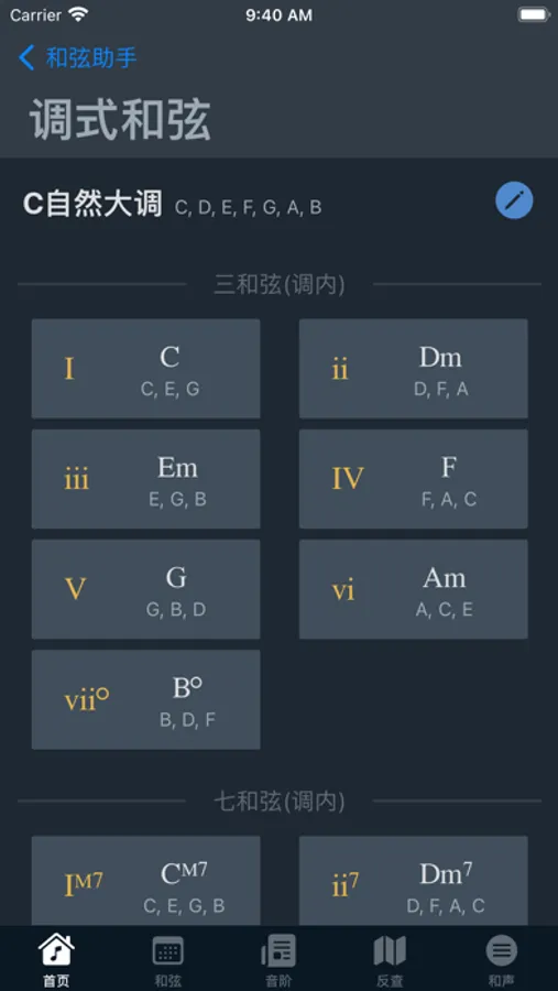 -【创建和弦】可根据自己的需要来设计新和弦类型。例如规则:1 3 5 b7 对应的是属七和弦,而规则1 3 5 b7 9对应的是九和弦等等。支持查看/删除自己的和弦。有个性的音乐的关键在于,使用属于自己的和弦,打造自己的和弦库吧。