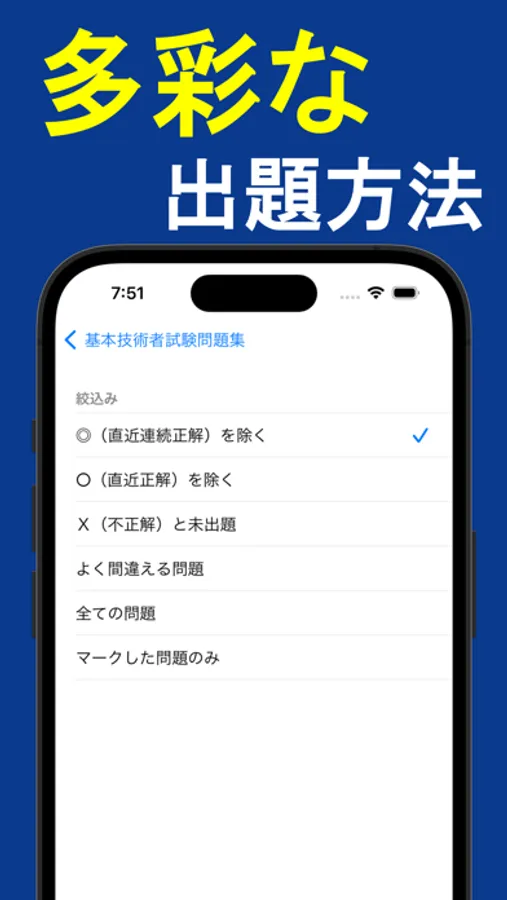 ● 問題のマーク機能はもちろん、理解度を確実にするために2回連続正解◎を除いて出題する機能を用意。 全て◎になるまで頑張りましょう!