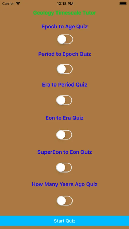 Geology Timescales Tutor is an app designed to help you to memorize the relations and proper categories between Ages and Epochs, Epochs and Periods, Periods and Eras, Eras and Eons, Eons and SuperEons. It helps also to memorize at what time a certain Age, Period and Era start in terms of thousands of years, millions of years and billions of years ago.