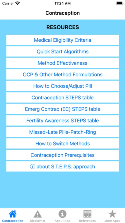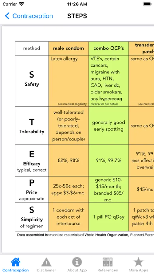 As the home screen screenshot shows, the resources in this app are: Medical Eligibility Criteria (contraindications) reference table, Quick Start Algorithms, table of Method Effectiveness, table of all OCP Formulations on the market and other non-pill hormonal formulations, guidance on How to Choose & Adjust OCP doses, STEPS criteria (safety, tolerability, efficacy, price, simplicity of regimen) for ALL contraceptive methods, focused STEPS comparative table for fertility awareness methods, focused STEPS comparative table for Emergency Contraception methods, guidance on how to switch methods, and a table of necessary exams and testing (prerequisites) before giving contraception.