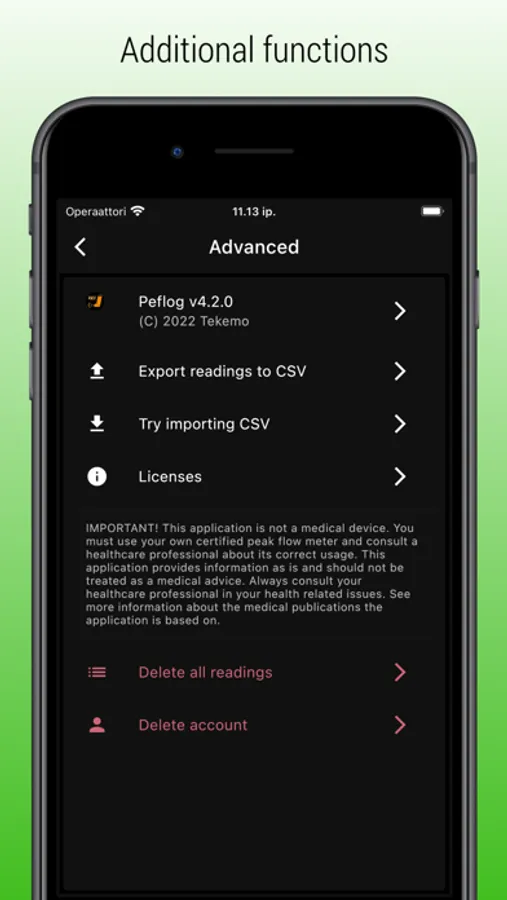 IMPORTANT! This applications is not a medical device nor its substitute. You must use your own certified peak flow meter and consult a healthcare professional about its correct usage. This application provides information as is and should not be treated as a medical advice. You should always consult your healthcare professional in your health related issues and appropriate usage of the information.