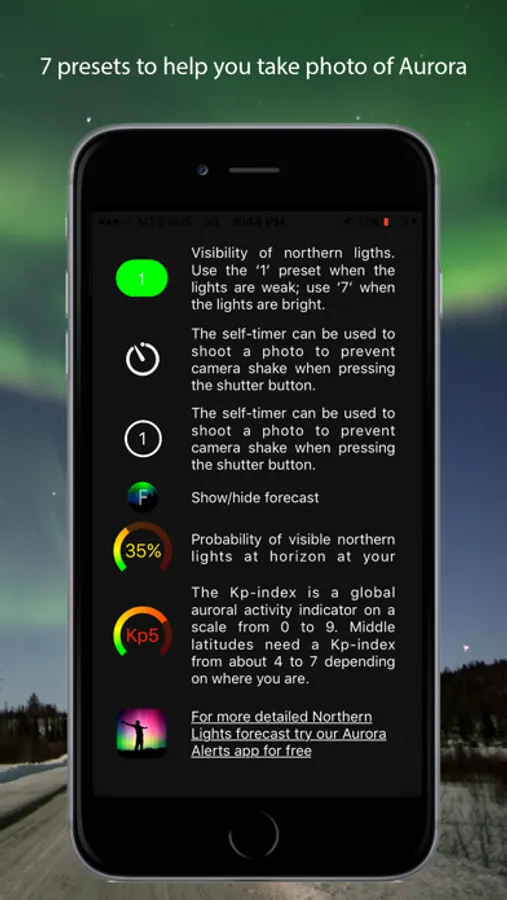 There are 7 presets that you can choose from based on the brightness of the aurora lights that you're seeing — all you have to do is tap the button that corresponds. Use the ‘1’ preset when the lights are weak; use ‘7’ when the lights are bright.