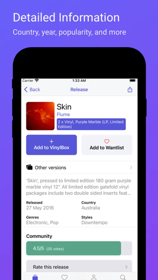 - View detailed release information including release date, country, popularity, extra artist contributors, and much more