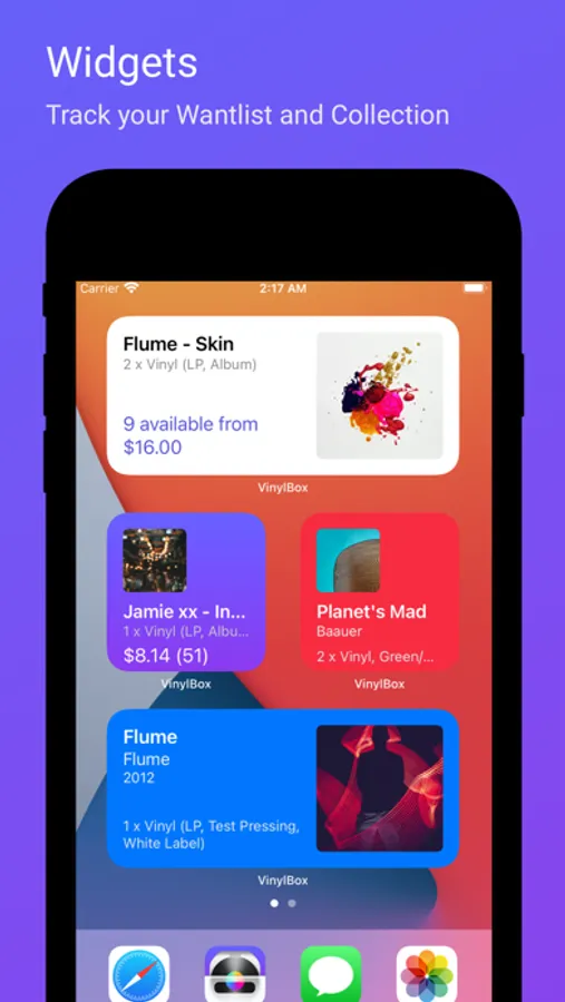 - Widgets for your homescreen to track the price of a release on the marketplace, or show a random release from your collection