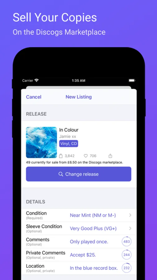 - Add details to your release such as media condition, sleeve condition, date purchased, or any notes
