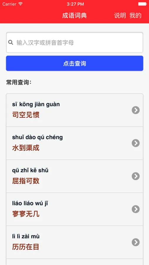 譬如要搜索 '愚公移山' 这个成语,可以在搜索框内输入拼音首字母 'ygys' ,然后点击搜索按钮。