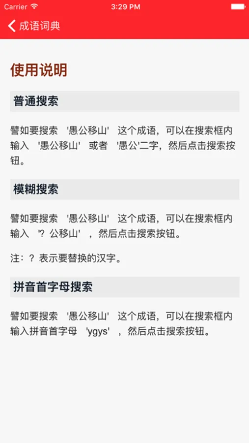 譬如要搜索 '愚公移山' 这个成语,可以在搜索框内输入 '?公移山' ,然后点击搜索按钮。
