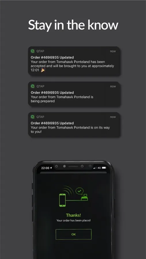 Just download and browse the menu from your selected venue. Create an order from the menu and pay for it via the app. Receive instant confirmation that your order has been received.