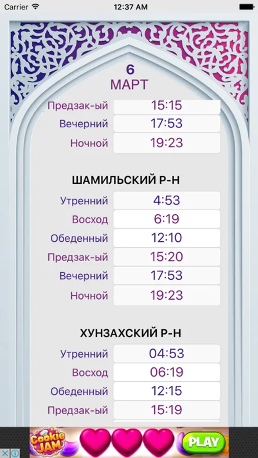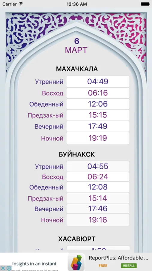 В приложении приведена время намазов для следующих городов и раионов: Махачкала, Бабаюрт Буинакск Даг Огни Дербент Избербаш Каспииск Кизилюрт Кизляр Хасавюрт Южно Сухокумск Ахвахский Ахтынский Ботлихский Гергебильский Гумбетовский Казбековский Левашинский Тляратинский Унцукульский Хунзахский Цумадинский Чародинский Шамильский и другие населенные пункты Дагестана