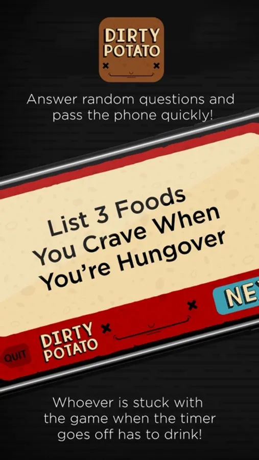 We took the classic Hot Potato idea, threw in some random (sometimes downright filthy) questions, a few embarrassing challenges and abracadabra, you've got Dirty Potato!
