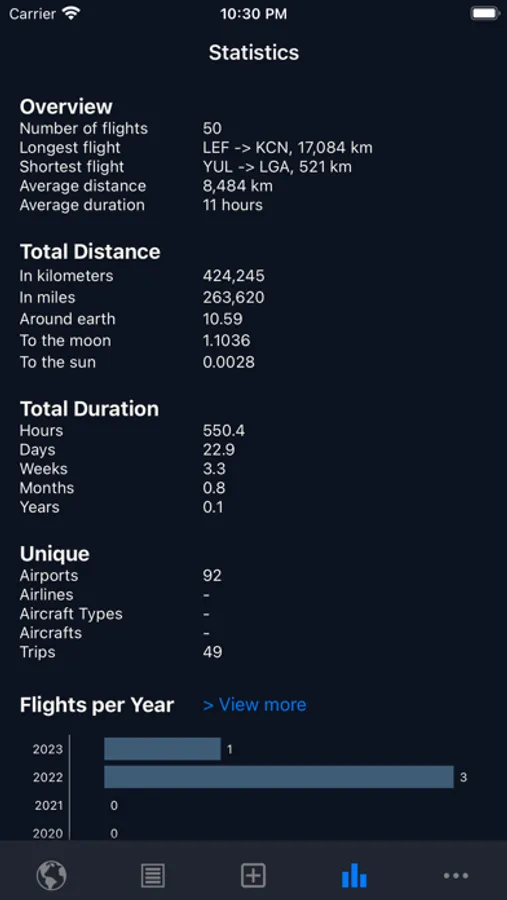 YourFlights allows you to visualize and analyze flights. It's the only app you'll ever need to keep track of all your flights and comes with the following features.