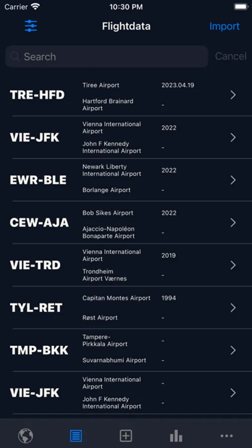 Visualize all your flights on a beautiful and interactive globe. You can freely rotate the globe, zoom in and out. Select specific years or flights from specific airports to display.