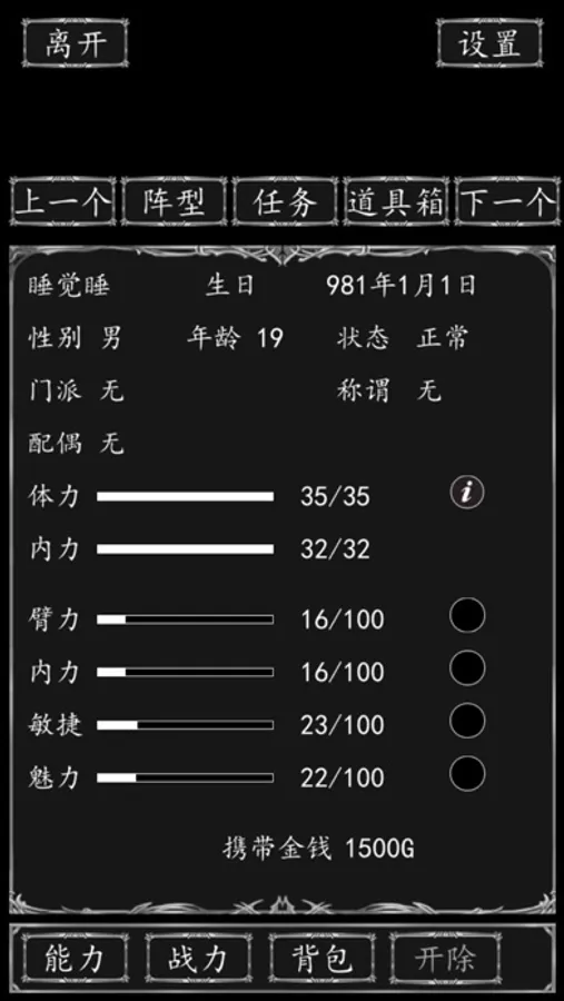 本游戏是一部全自由模式单机RPG游戏,游戏内所有剧情完全由玩家自由选择,整个游戏无任何限制,整个世界走向完全由玩家自己定义。玩家扮演一个初入江湖的侠客,游走在各大门派之间,通过接各种委托任务赚钱,同时不断提高自己的武学修为和江湖声望,组建自己的队伍。玩家在游戏中可以通过自己努力最终击败所有高手,成为一代武林至尊!