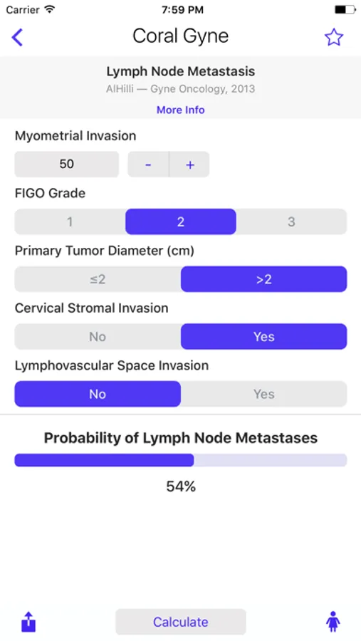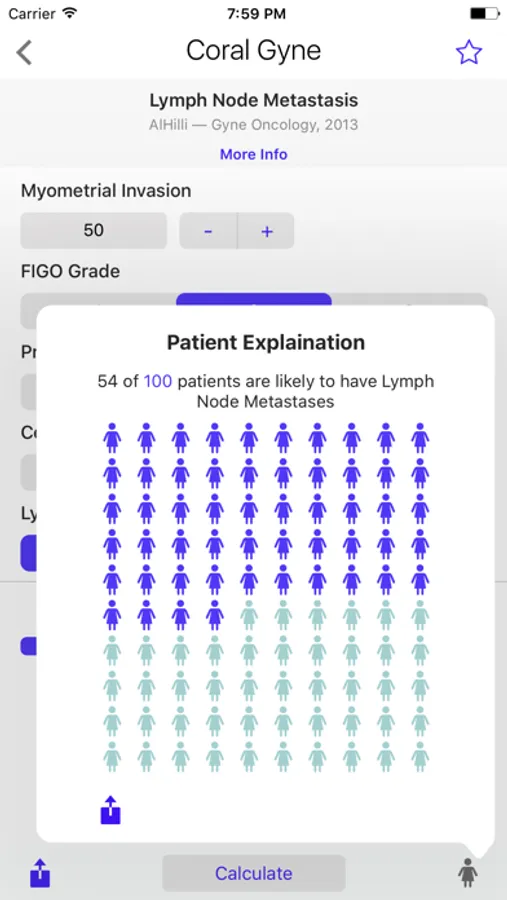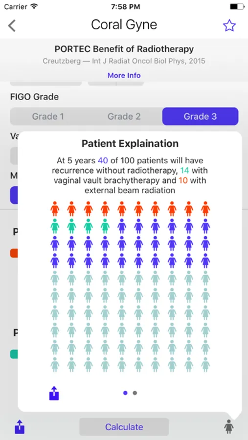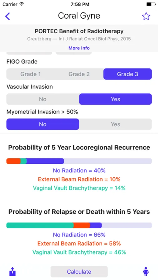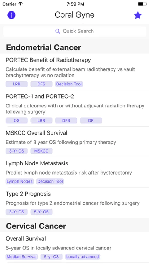 Coral Gynecology features well known nomograms such as PORTEC outcomes for endometrial cancer, and established tools for cervical and vulvar cancer. CORAL features organized lists with tags, source references, variable descriptions and easy to understand patient explanations with individualized infographics.