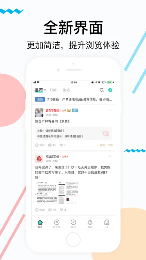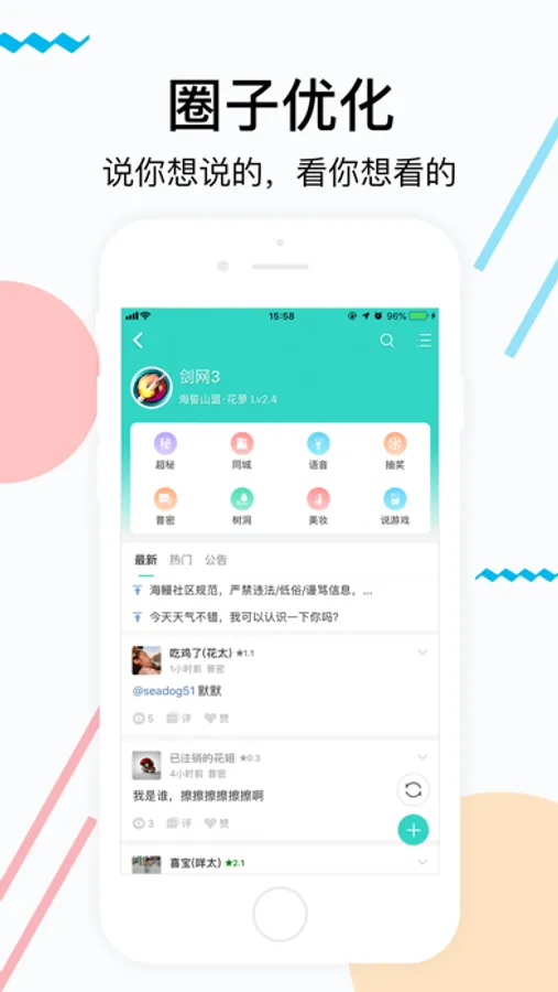 【轻匿名社区】同玩一款游戏让我们有了共同的话题,目前已开设王者荣耀、绝地求生(吃鸡)、剑网三等多个游戏圈子。用户可以创建富有代入感的“游戏皮”,告别社交恐惧,诉说心事秘密,寻找开黑队友。