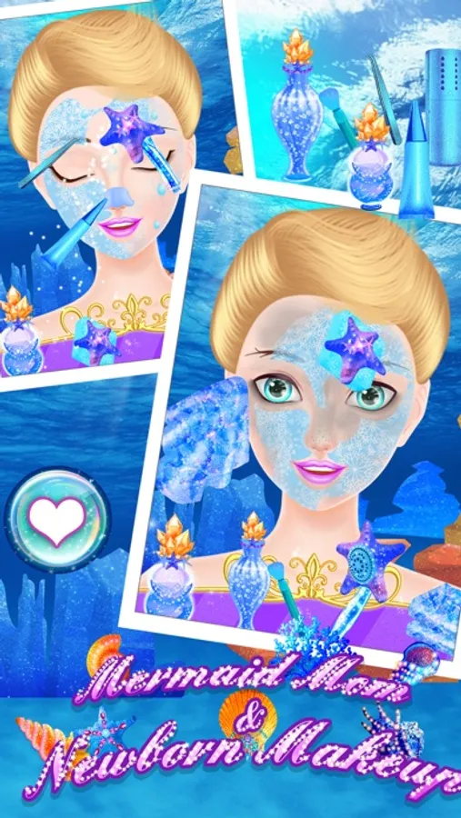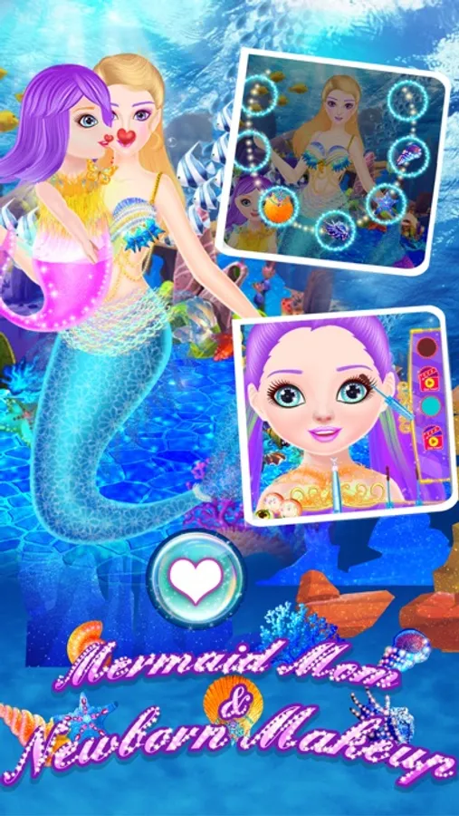 There is a beautiful mermaid in the sea world. She has one newborn baby recently. Come to help mermaid and her baby to make up beautifully in this brand new game. First step, you need to give mermaid a face spa. Clean her face by using facial cleanser. Then get rid of her black eyes and blackheads one her nose. Modify her eye brow shapes and after that, you can make facial and eyes masks for her and then put some facial creams to make her face skin much more charming. The second step, you can let mermaid and her baby play together happily. Make one beautiful necklace by using the shells for the baby. Let mermaid use her magic wand to make the sea fish have a nice performance. Thirdly, you need to try your best to make up for mermaid. You can use our given cosmetics to show us your excellent make up skills. Choose the most suitable contact lenses, eyebrow colors and eye lines for her. Use the bright foundation make-up and blusher to make her look amazing as you can. The fourth step, you can use the same methods to make up for the baby. Make her look nice and lovely. Fifthly, dress up for mermaid and her baby. Change their hairstyles and choose nice mermaid make up and accessories to make them be satisfied. Last step, show us this wonderful mermaid and baby. Have fun.