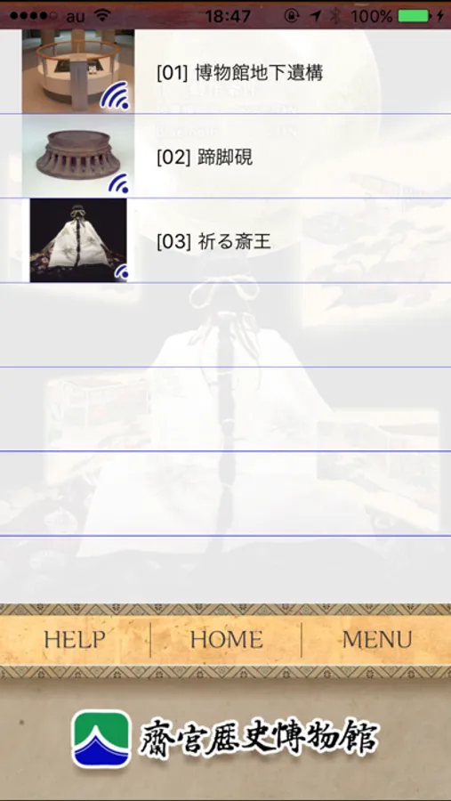 2.斎宮歴史博物館、斎宮跡歴史ロマン広場及び史跡公園さいくう平安の杜内に設置された情報発信機からの電波を受信すると、展示物や復元建物などの情報がリスト表示されます。