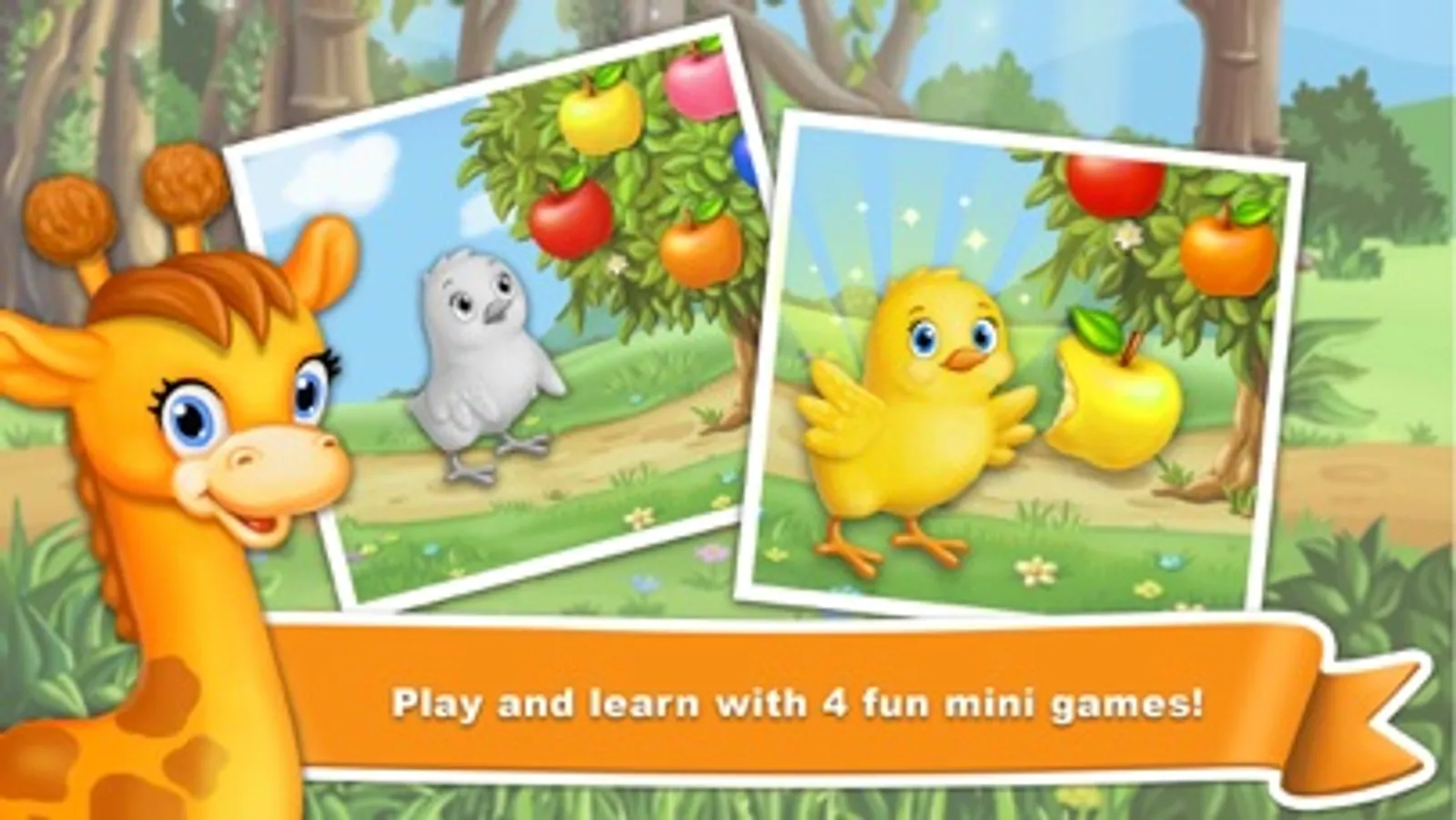 4) Your toddler watches an apple tree with apples of different colors. One of the animals learned before comes up to the apple tree. The kid should feed the animal with an apple of the same color as the animal is.
