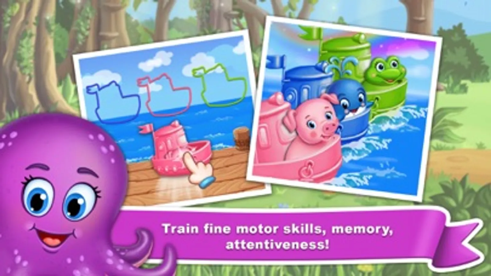 2) There are 3 contours of ships painted in different colors in the upper part of the screen. Your baby sees an unpainted ship with a learned animal onboard. The child is to recollect what color the animal should be and to pull the ship into the corresponding contour.