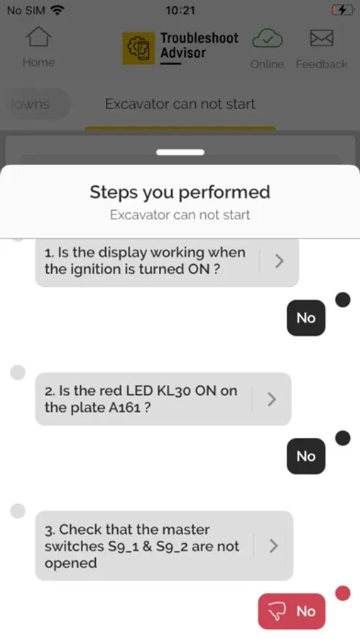 The process is simple: connect, select the problem, and let the application guiding you. In addition to the problem resolution guidelines, users have the opportunity to contact Liebherr’s team for assistance or feedback.