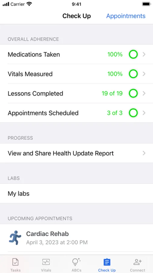 4. Check Up: schedule and track follow up appointments with healthcare providers and cardiac rehabilitation. Share your progress reports with your healthcare team and others who help support you reaching your health goals.