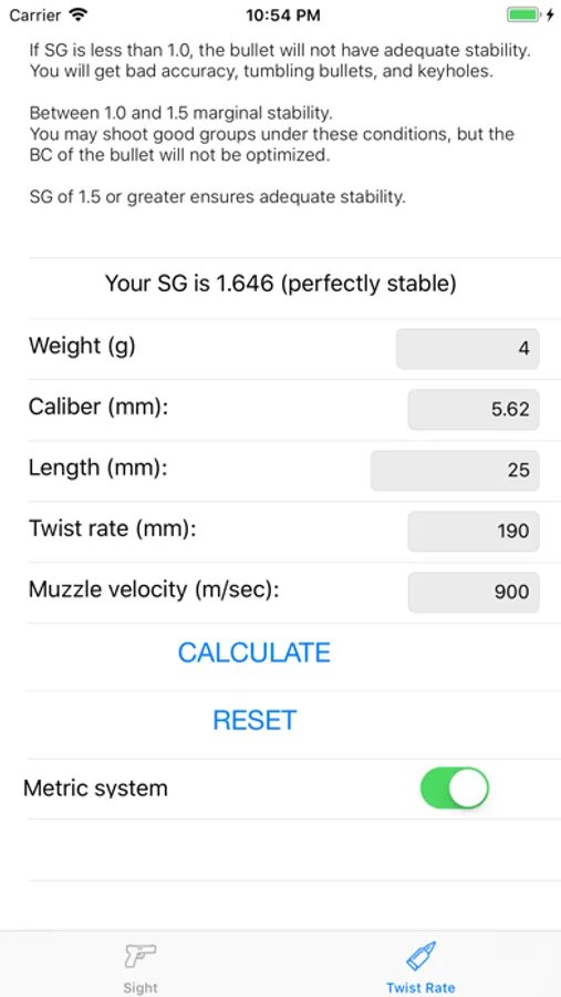 To calculate stability factor (SG) you need to enter parameters of the bullet: weight, caliber (diameter), length, velocity, and twist rate (will be calculated for a standard ambient temperature of 59°F / 15°C, atmospheric pressure 750 mm Hg. humidity 78%).