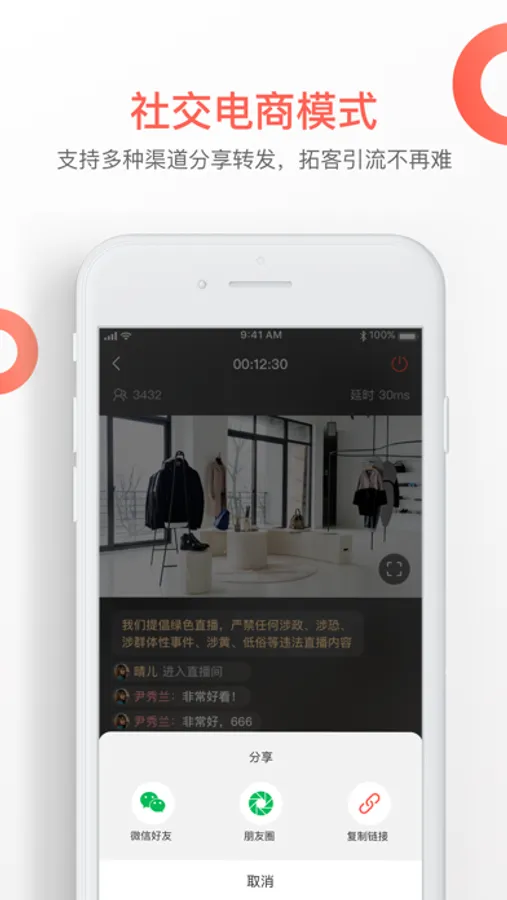 当绑定智能产品后即可进行直播卖货,并且支持将视频分享转发至多种渠道或亲朋好友,扩大流量池。