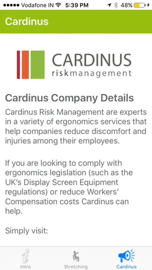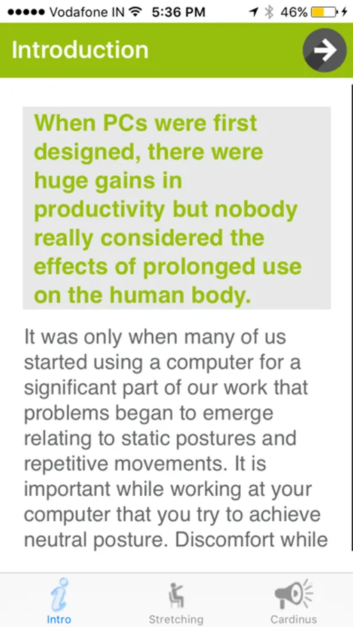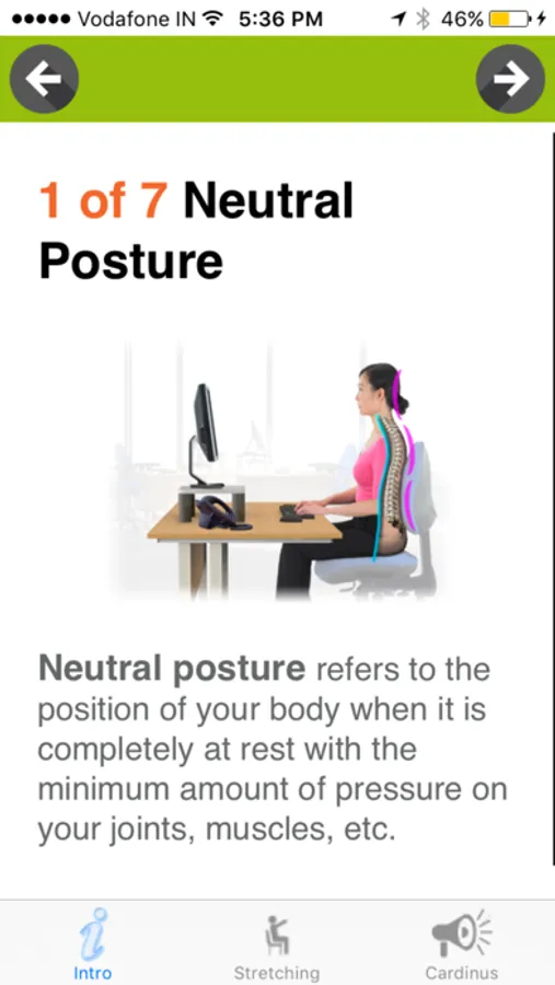 The app also includes some practical tips for setting up your computer and desk so that you can minimize your exposure to bad posture whilst you work which can lead to stiffness, discomfort and fatigue more quickly and can increase levels of discomfort.