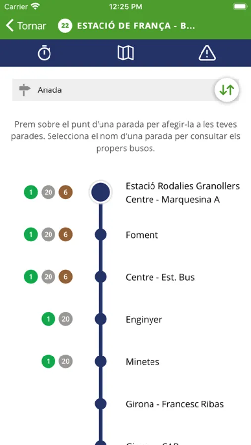 - Línies i recorreguts: permet accedir al termòmetre de cada parada, i al clicar sobre una parada en concret et dóna el temps de pas real del següent bus i les properes sortides programades. A més permet guardar una parada com a favorita, consultar les incidències o descarregar un pdf amb l’horari complet de la línia.