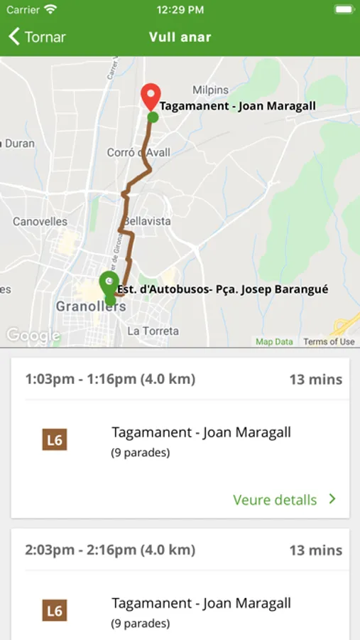 - Parades a prop: Et marca en un plànol les parades més properes a la ubicació de l’usuari. I al clicar sobre una parada en concret et dóna el temps de pas real del següent bus i les properes sortides programades.