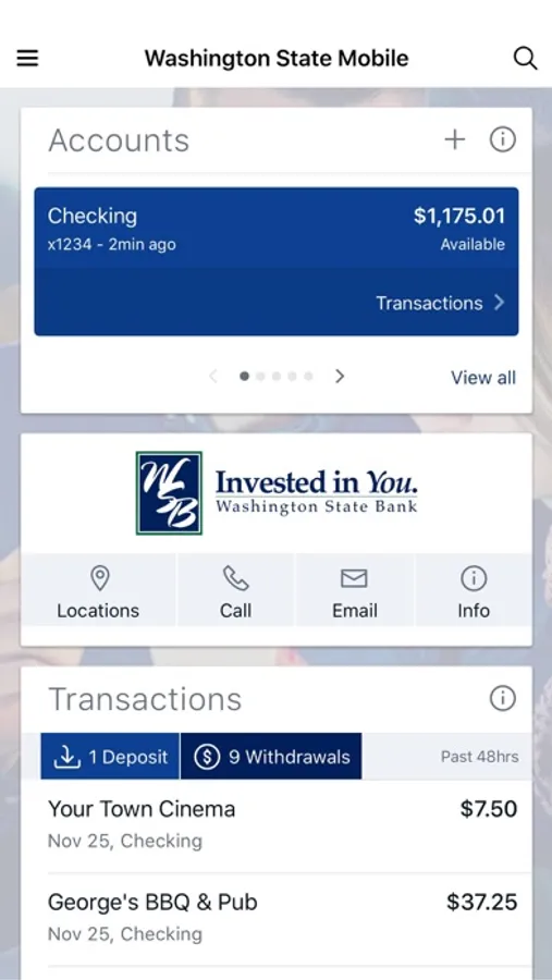 To use the Washington State Mobile App, you must be enrolled as an Washington State Bank Internet Banking user. If you currently use our Internet Banking, simply download the app, launch it, and login with the same Internet Banking credentials. After you successfully login to the app, your accounts and transactions will begin updating.