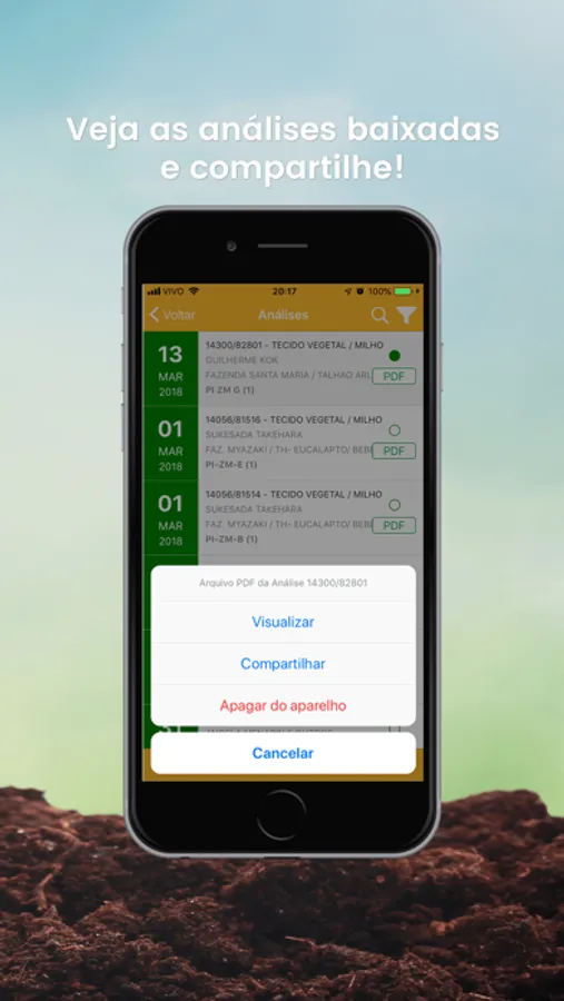 • Compartilhar o arquivo PDF de suas análises. Você poderá compartilhar utilizando os aplicativos já instalados no seu aparelho como cliente de e-mail, mensageiros (como o WhatsApp e Telegram), conexão bluetooth, DropBox, Google Drive, etc..