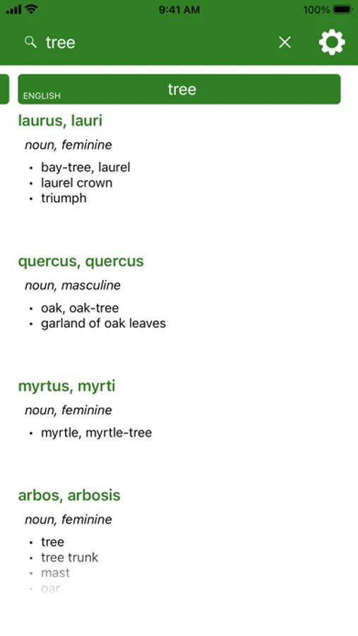 - Parsing of word endings for when you can't figure out what the main form of the word is (e.g. searching "silvarum" will bring up the Latin word "silva" as a result even though "silvarum" isn't the nominative singular form)