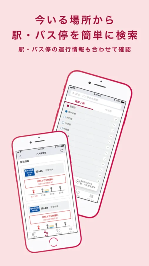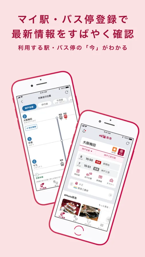 阪急沿線の交通情報・おでかけ情報を提供する「阪急沿線アプリ」は、阪急電鉄の各駅の発車時刻や列車の走行位置に加え、遅延時分、到着見込み時刻をご提供します。また、阪急バスの各バス停の発車時刻、接近情報や遅延時分、到着見込み時刻も確認できます。