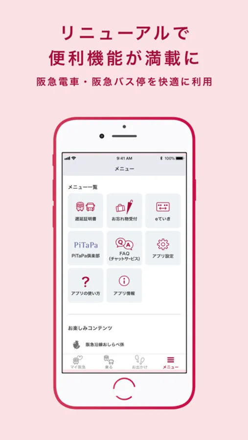 阪急電鉄の運転見合わせや大幅な遅れが生じた場合、スマートフォン端末に運行情報をプッシュ通知します。また、臨時列車の運行や駅施設のメンテナンス、ハイキングの開催、鉄道グッズの販売などの各種情報をご提供します。