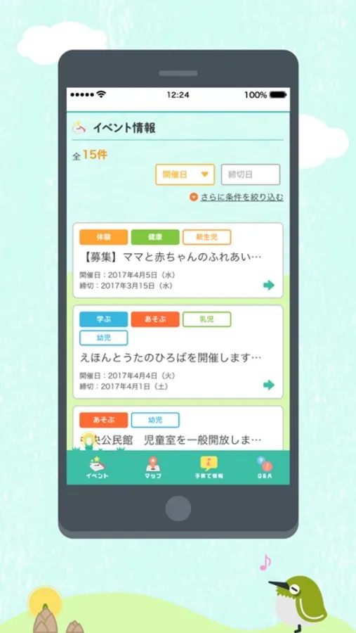 学ぶ、あそぶ等のカテゴリーや託児あり、無料のイベントを検索できます。