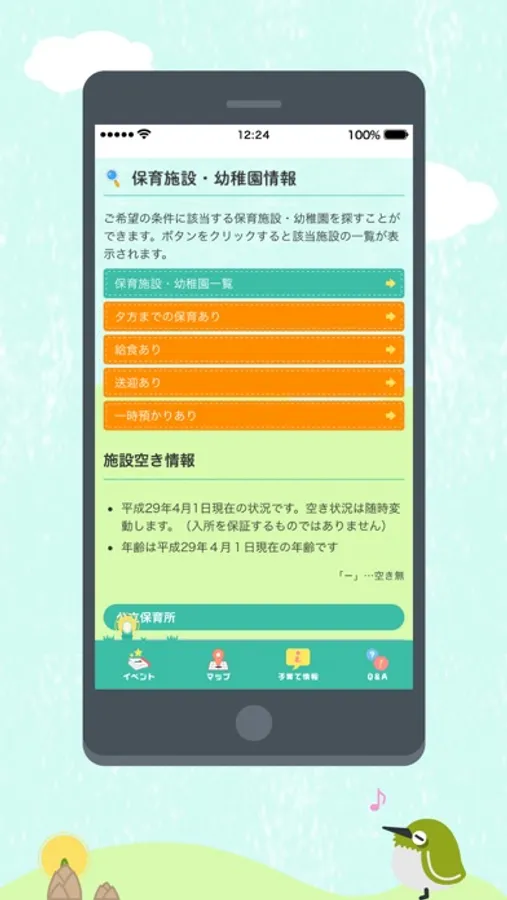 送迎あり・給食ありの施設や保育所・保育園・こども園などの空き状況を確認できます。