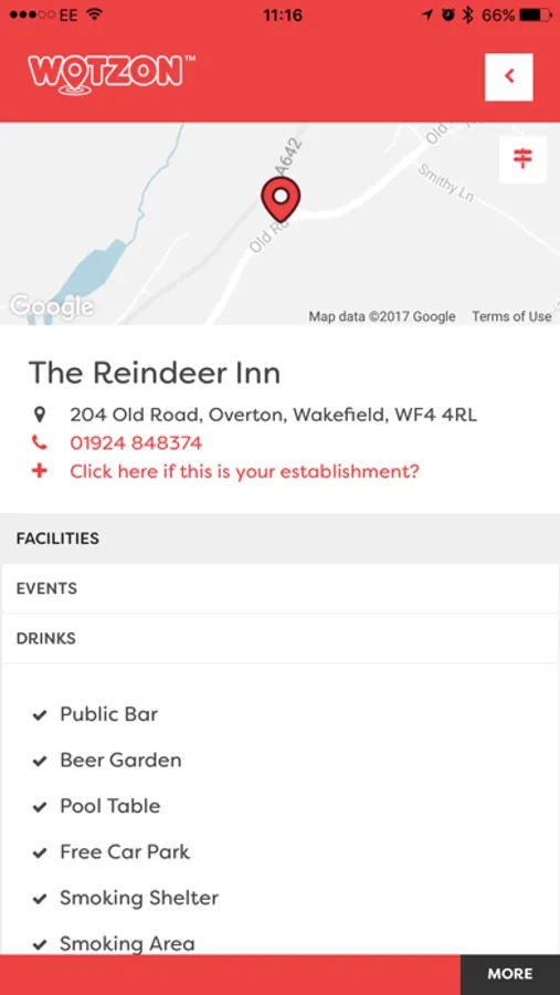 Click ‘VIEW MORE’ to open up the establishments’ profile. From here, you can see all of its drinks, food, facilities, events, live sport, and promotions.