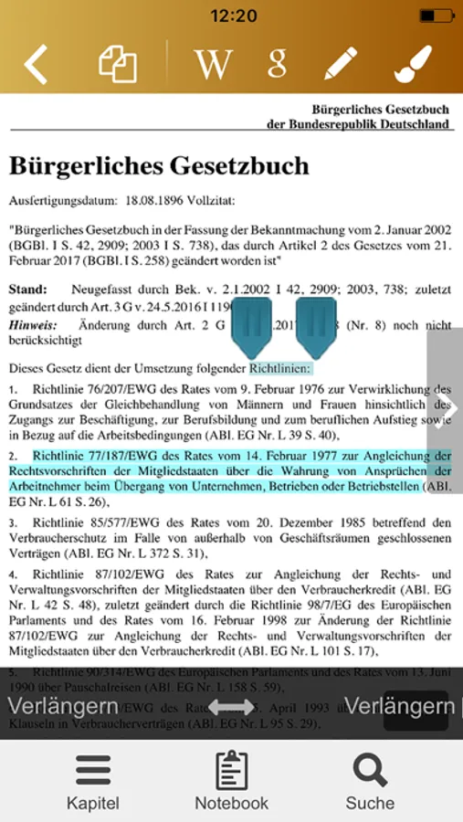 Die Suchfunktion ermöglicht es, beispielsweise das BGB direkt nach Stichworten zu durchsuchen. Mit einem einfachen Doppelklick können sie ausgewählte Wörter direkt auf Google nachschlagen. Über die Menüleiste im unteren Bildrand können gezielt Notizen zu einzelnen Artikeln erstellt werden. Des weiteren verfügt die Applikation über die Funktion Textstellen zu markieren und Buchzeichen zu setzen.