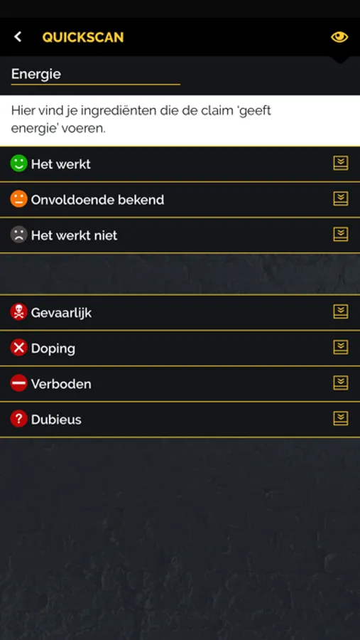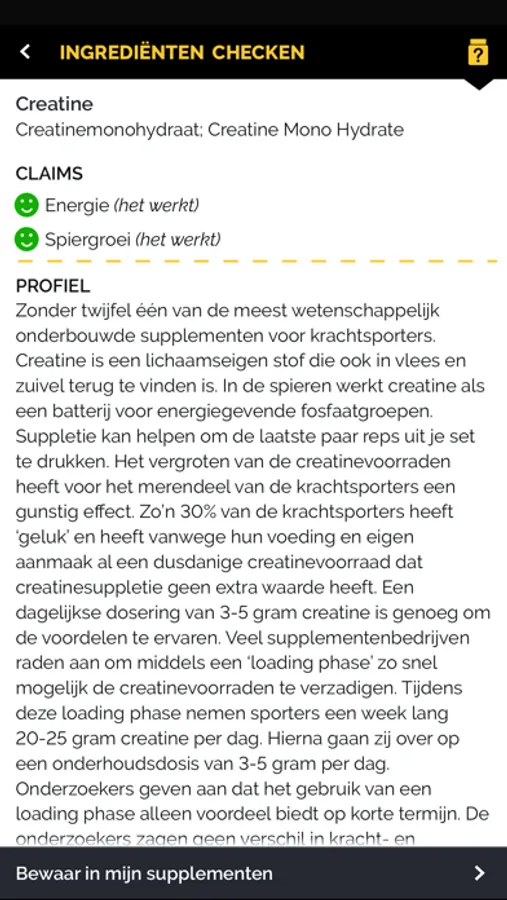 Met de App krijg je informatie over ruim 3000 van de meest voorkomende ingrediënten/stoffen die met het oog op fitness en sport in de markt zijn gezet. De bespreking en beoordeling van de ingrediënten stellen de gebruiker in staat om zich een goed beeld te vormen van het merendeel van het aanbod aan supplementen.