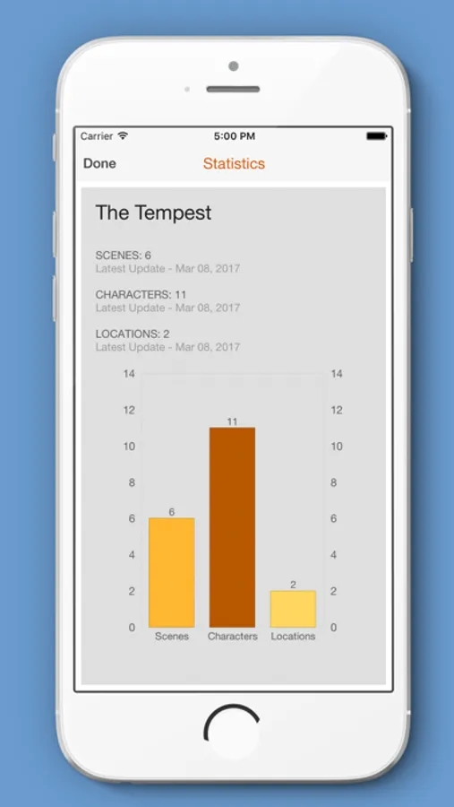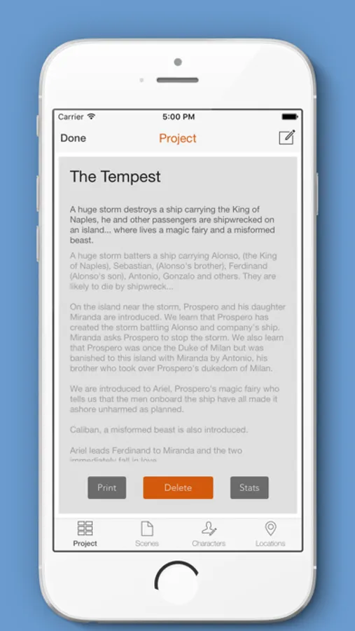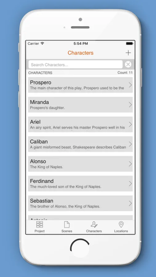 - create individual Projects for each play, novel or story, containing unlimited Scenes/Chapters/Acts, Characters and Locations/Settings.