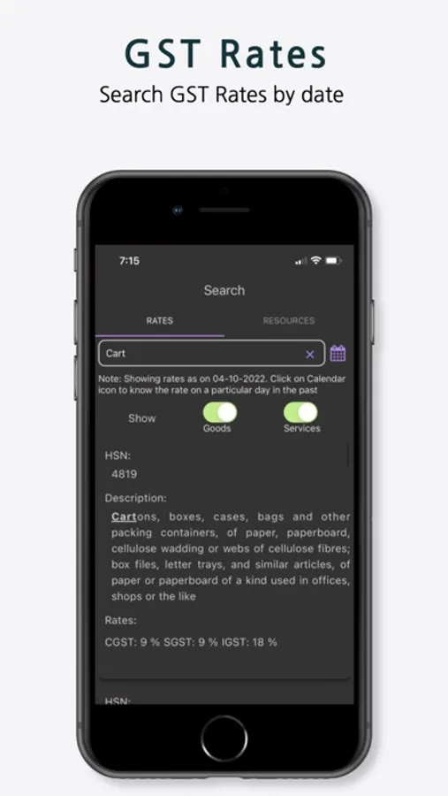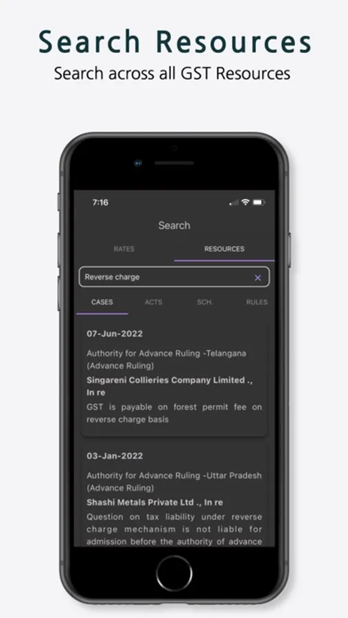 1. One of the best features of this app is its great Search functionality. All the GST resources such as Case Law, Rates, Acts, Rules, Notifications, Circulars, Orders, FAQs are indexed. So, you can type anything you want to search for and all the relevant GST resources are automatically retrieved for you. You can search across all the resources at once or you can search within a specific GST resource.